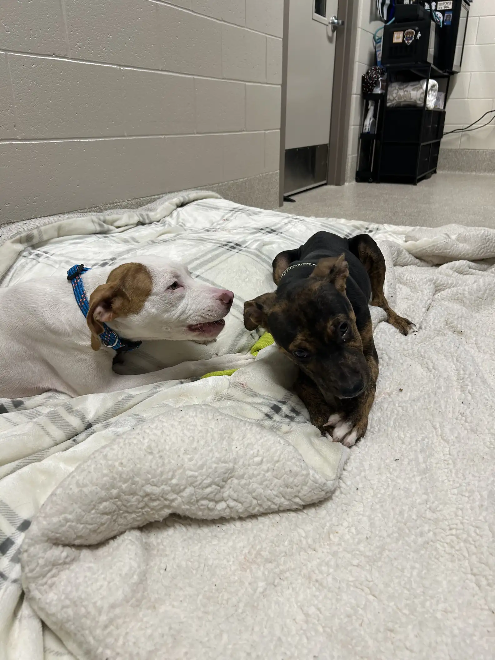 “These boys are pretty typical puppies; however, [they] have two different personalities,” Pitz said. “The black and tan boy is a bit more shy and can be a bit of a doofus. The white and tan boy is quick and smart and can be a bit more outgoing and bossy! They get along super well and would likely do great with another dog to live with in their forever homes.”