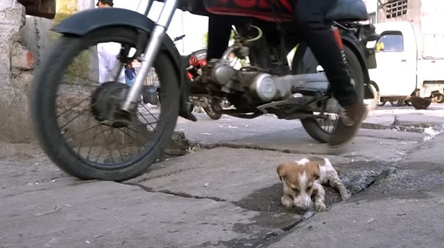 The sight was devastating. Motorcycles sped past without a second glance as the weak puppy attempted to stand but collapsed in pain. His back leg appeared severely injured, making it impossible for him to move on his own.