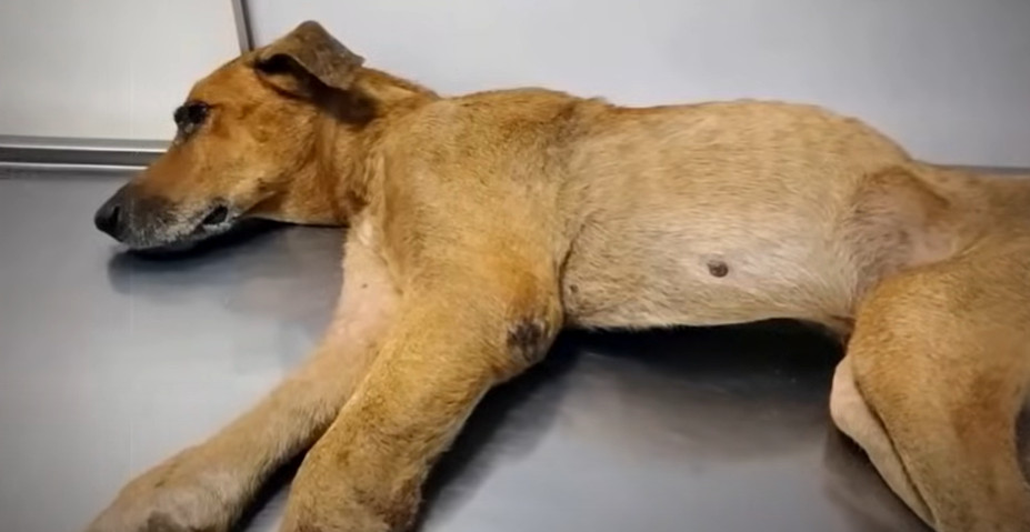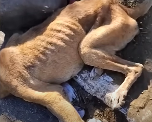 The dog, later named Magma, was in a critical state when rescuers arrived. He was dangerously thin, dehydrated, and emotionally shut down.