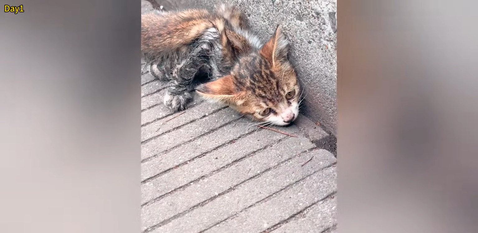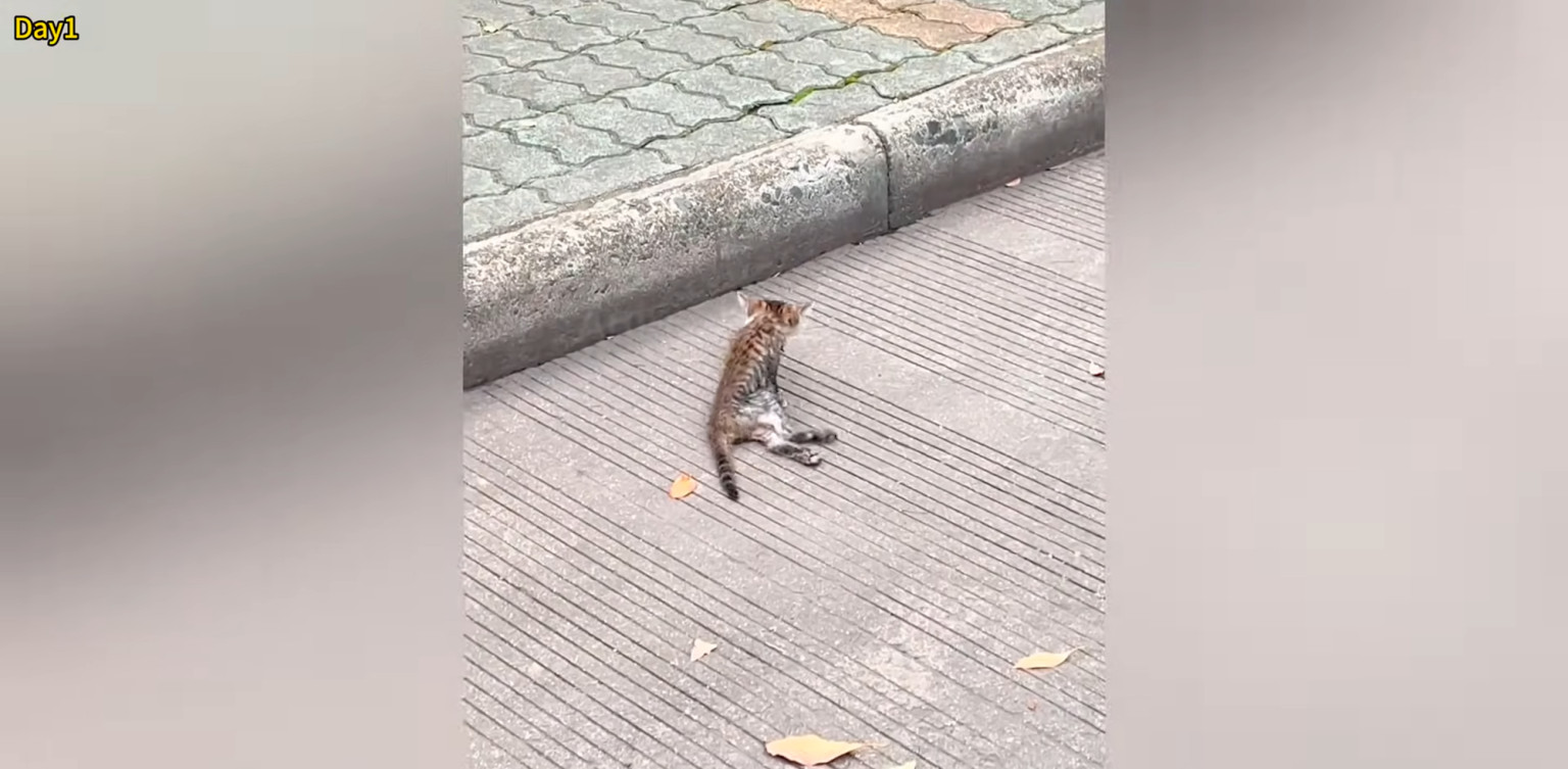 Alarmed, I rushed out to find a tiny cat with an injured leg, desperately trying to climb onto the sidewalk. The step was too high for his fragile body, and exhausted, he collapsed on the ground.