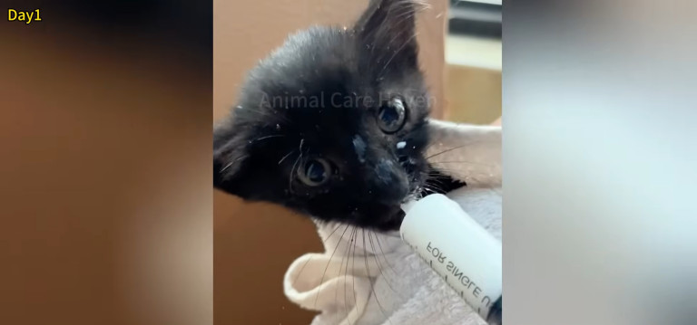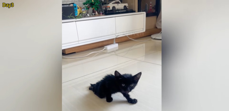 (Paralyzed and alone, a tiny black kitten fought to survive. With love and care, she found not only a home but the strength to stand again.)