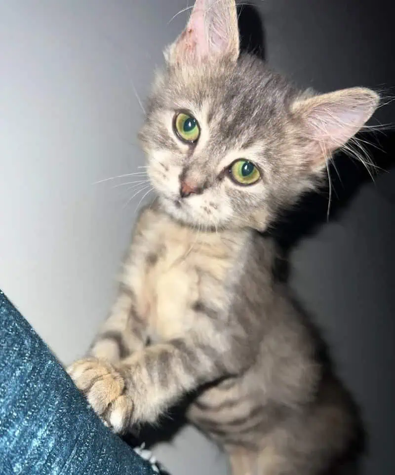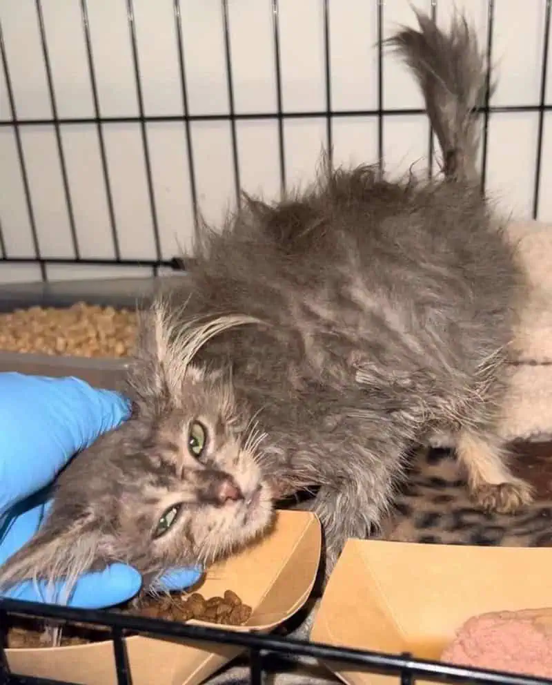 This scruffy kitten was discovered behind a tire at the job site just over a month ago. She was in poor condition, emaciated, infested with fleas, and missing a significant amount of fur.