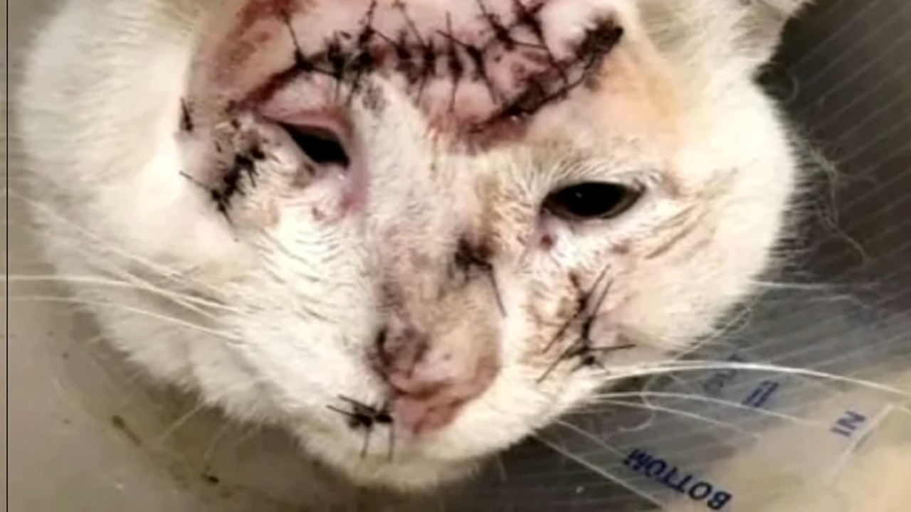 Snow, his face disfigured with deep gashes and stitches, was found by a compassionate woman walking her dog. Horrified by his condition, she rushed him to a veterinary clinic.