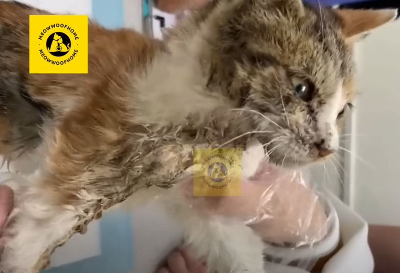 The cat appeared outside a small restaurant, dragging itself weakly along the pavement. Its body was thin, its fur matted and unkempt, and one of its legs hung limp, broken from an injury left untreated.